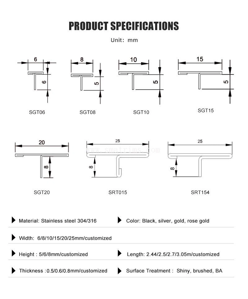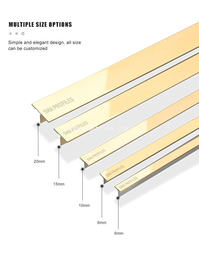 स्टेनलेस स्टील टाइल ट्रिम 6 मिमी अपेक्षाकृत पतली टी-आकार की पट्टी है। टी-आकार की पट्टी मुख्य रूप से फर्नीचर, कैबिनेट दरवाजे, पृष्ठभूमि की दीवारों, छत आदि की सजावटी लाइनों के लिए उपयोग की जाती है, जबकि 6 मिमी चौड़ाई वाली टी-आकार की पट्टी का उपयोग आमतौर पर फर्नीचर, कैबिनेट दरवाजे और पृष्ठभूमि की दीवार में किया जाता है। अपने विचारों के माध्यम से विभिन्न आकृतियों और शैलियों में डिजाइन और मिलान कर सकते हैं।